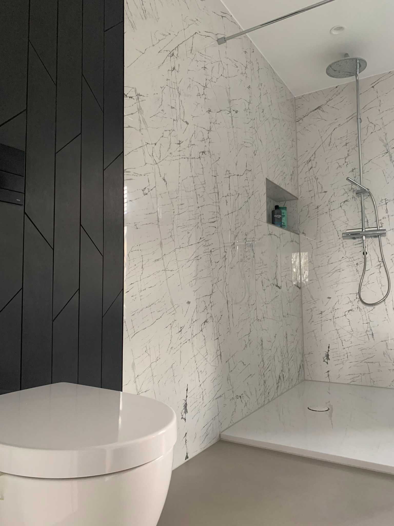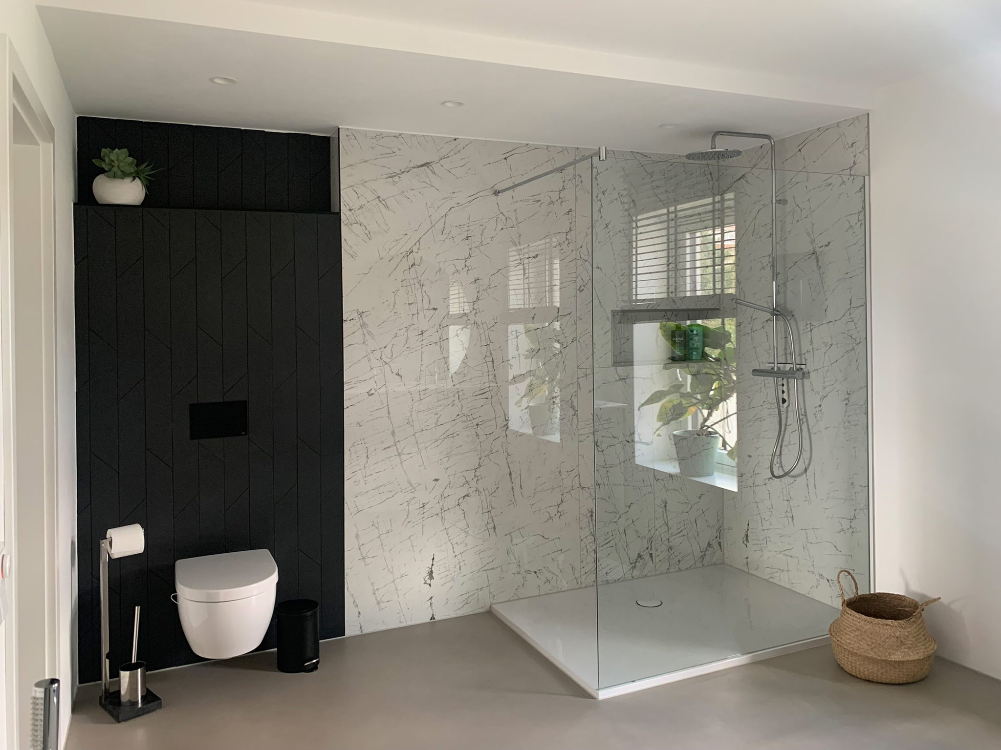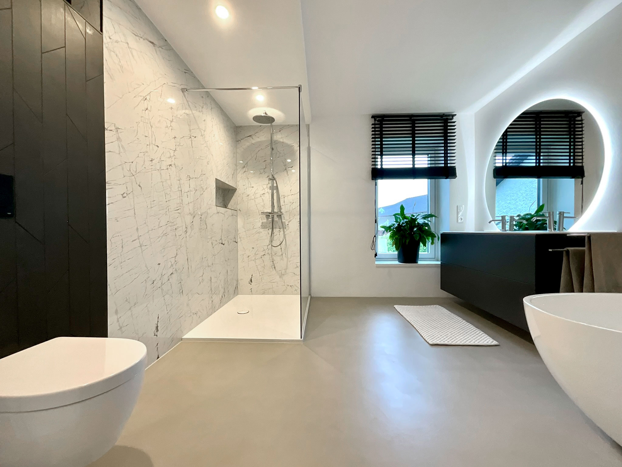 Kernsanierung eines Badezimmers aus den 80er Jahren in Pfaffenhofen an der Ilm mit fugenlosem Boden und hochwertigen Marmorfliesen – eine moderne, ruhige Gestaltung mit klaren Linien und zeitloser Eleganz.